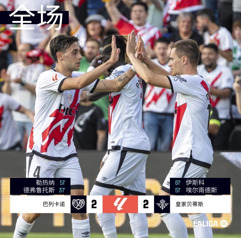 nba直播讯 北京时间5月16日,西甲联赛第36轮展开一场精彩对决,巴列卡诺主场迎战皇家贝蒂斯。双方上演进球大战,最终2-2握手言和。