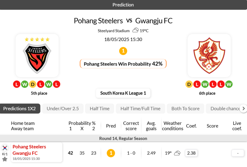 - Pohang Steelers's latest clashes with Gwangju FC have been low-scoring with under 2.5 goals in each of their last 3 home encounters in K League 1.