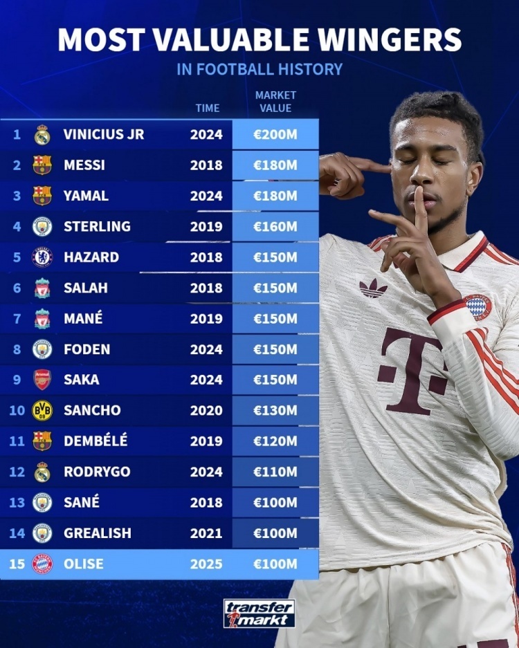 nba直播讯 北京时间6月6日,德国转会市场列出了边锋历史最高身价排名,维尼修斯2亿欧居首,梅西、亚马尔1.8亿欧次席,斯特林1.6亿第三,本赛季表现出色的奥利塞1亿欧上榜。