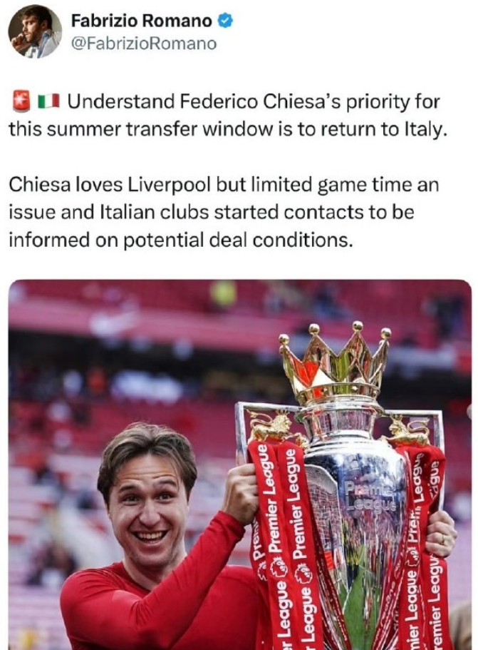 “基耶萨对利物浦充满了好感,但出场时间有限是一个问题。与此同时,多家意大利俱乐部已经开始接触,以了解潜在交易的相关条件。”