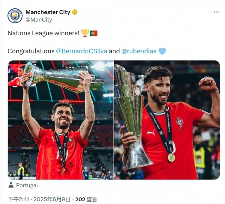 随后不久曼城官方社媒晒出队内的葡萄牙国脚B席、鲁本-迪亚斯与奖杯的合照,配文:“欧国联冠军!祝贺B席和迪亚斯。”