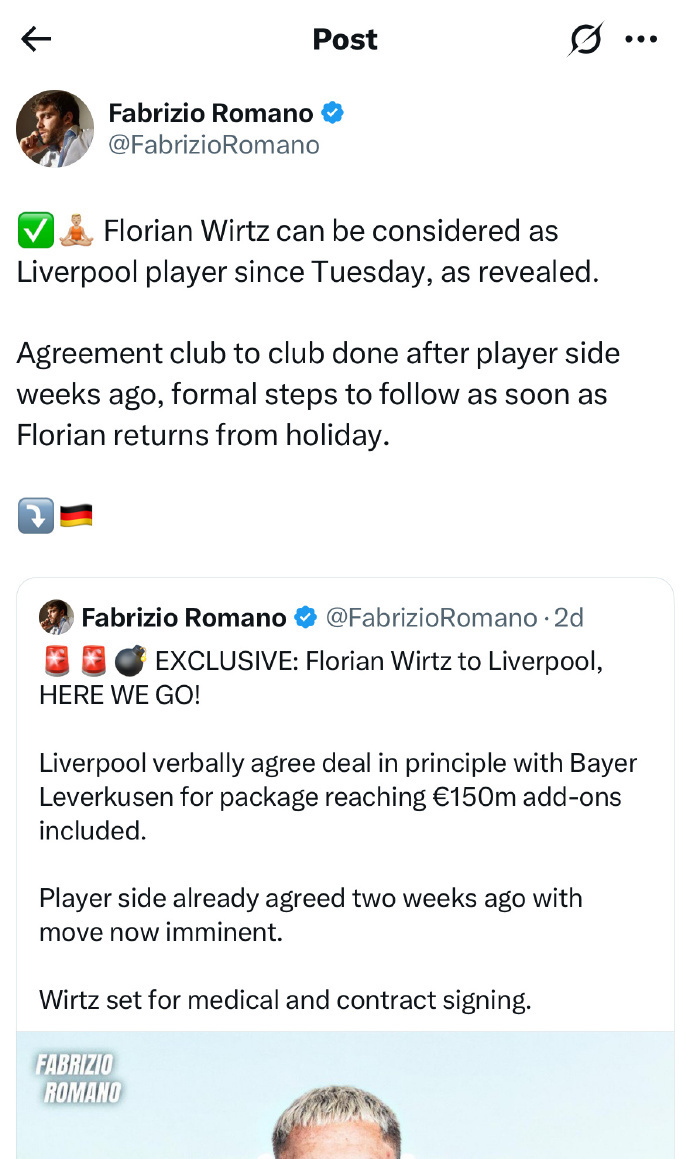 罗马诺说道:像我之前透露的,弗洛里安·维尔茨自周二以来就可以被认为是利物浦球员了