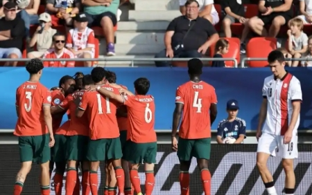 nba直播讯 欧洲U21国家杯小组赛末轮,葡萄牙U21以4-0的比分完胜十人应战的格鲁吉亚U21,以小组头名身份强势晋级淘汰赛。这场在罗马尼亚进行的比赛中,葡萄牙队展现了强大的整体实力,18岁新星昆达贡献一传一射成为最大亮点。