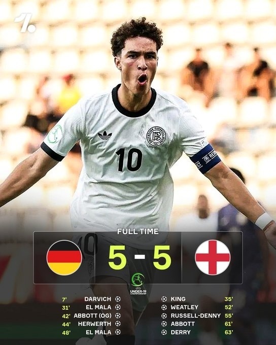 nba直播讯 英格兰U19在U19欧洲杯中5-5战平德国U19,创造U19欧洲杯最大比分纪录。本场比赛,英格兰在1-5落后的情况下在下半场连追4球,奇迹般的扳平了比分,这也创造了U19欧洲杯的历史最大比分纪录。