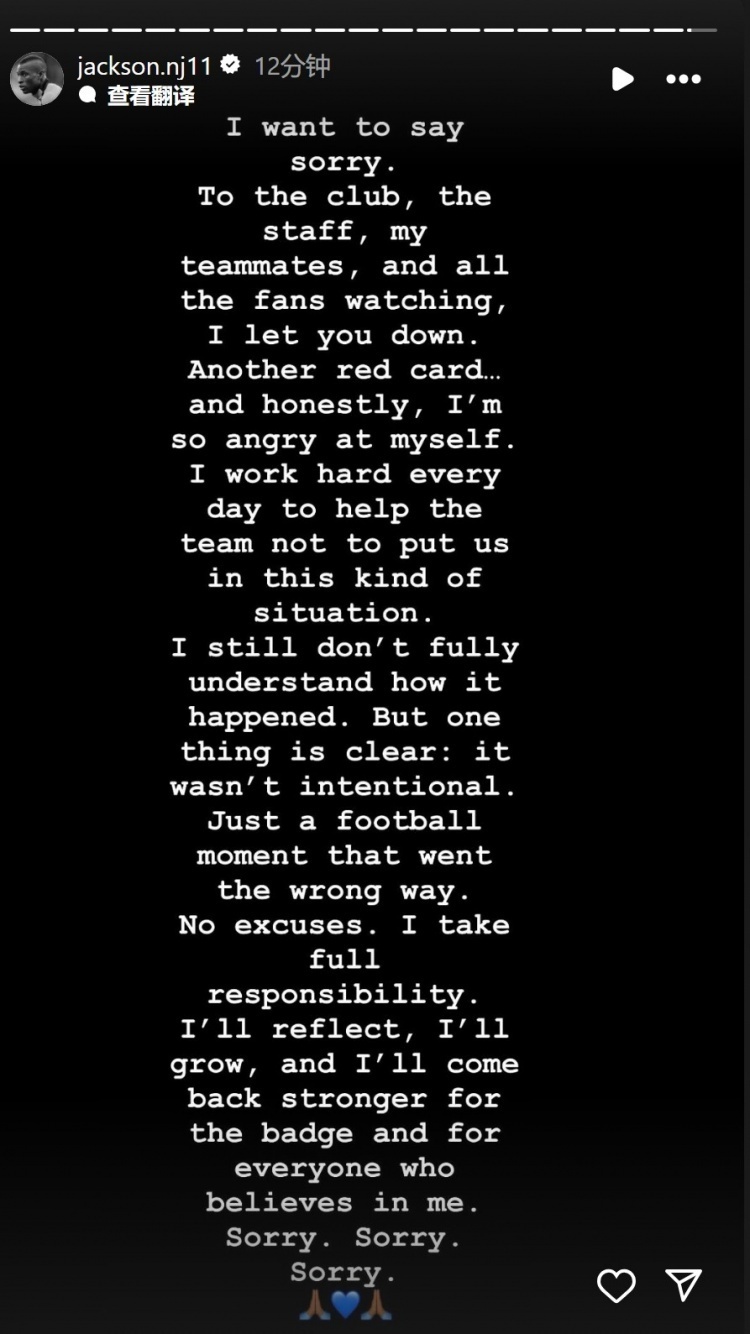 杰克逊赛后社媒发文道歉:“我想说声对不起。对俱乐部、工作人员、我的队友,以及所有观看比赛的球迷,我让你们失望了。