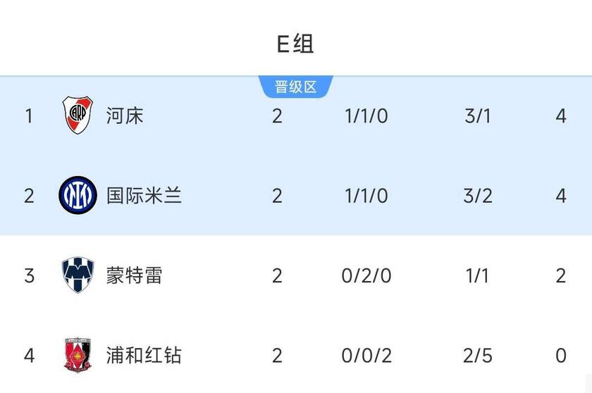 nba直播讯 北京时间6月22日, 随着河床0-0战平蒙特雷,国米2-1击败浦和红钻,世俱杯小组赛E组第2轮全部战罢,河床目前凭借净胜球优势排在小组第1,国米次席,蒙特雷第3,浦和红钻两连败提前出局。