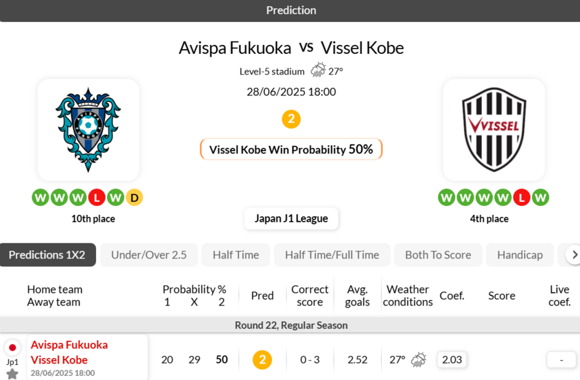 - Vissel Kobe are on a successful run against Avispa Fukuoka, which consists of 5 away wins in J1 League.