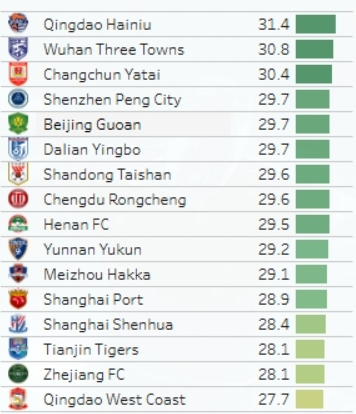中超共16支球队中,平均年龄最大的是青岛海牛的31.4岁,最小的是青岛西海岸的27.7岁。
