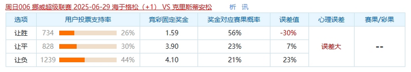 本场比赛中,选择海于格松获让球胜的球迷偏少了,只有26%的球迷选择获让球胜选项,这场比赛中,大家都看好客队的克里斯蒂安松能够直接赢或者大胜赢得这场比赛,不看好海于格松能在主场保住分数,但是这也与奖金对应赛果概率的56%相差30%。