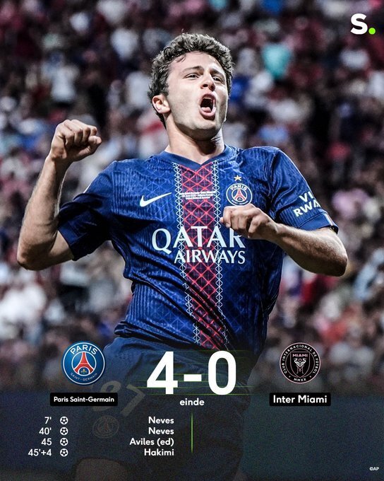 世俱杯 1/8 决赛,巴黎圣日耳曼对阵迈阿密国际。比赛第 6 分钟,维蒂尼亚助攻若奥 - 内维斯头球破门,巴黎 1-0 领先。第 39 分钟,布斯克茨失误被断,法比安横传,若奥 - 内维斯推射空门完成双响,巴黎 2-0。第 45 分钟,杜埃右路传中,阿维莱斯不慎自摆乌龙,巴黎 3-0。上半场补时阶段,维蒂尼亚挑传,巴尔科拉倒三角回敲,阿什拉夫补射破门,巴黎 4-0 锁定胜局。下半场梅西多次威胁对方球门,但未能进球。最终巴黎 4-0 淘汰迈阿密,晋级八强,1/4 决赛将对阵拜仁与弗拉门戈之间的胜者。