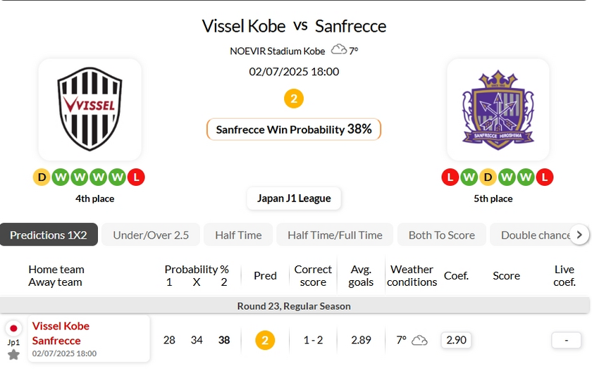 在J1联赛最近的3场主场比赛中,神户胜利船已经打进了2.5个进球