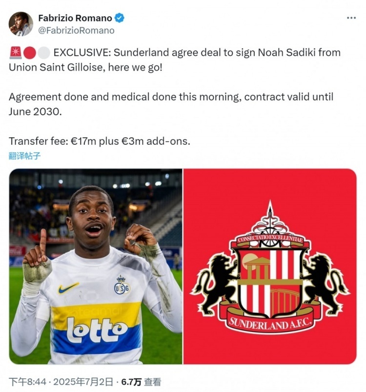nba直播讯 北京时间7月2日,据知名记者罗马诺报道,桑德兰引进圣吉罗斯中场萨迪基达成协议,Here we go!球员今天上午完成了体检,他将与桑德兰签约至2030年6月份,转会费1700万欧加300万欧浮动。