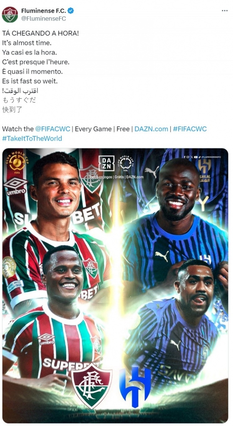 nba直播讯 北京时间7月4日,弗鲁米嫩塞即将在世俱杯1/4决赛中对阵利雅得新月,弗鲁米嫩塞官方社媒用9种语言预热,中文写道:“快到了。”