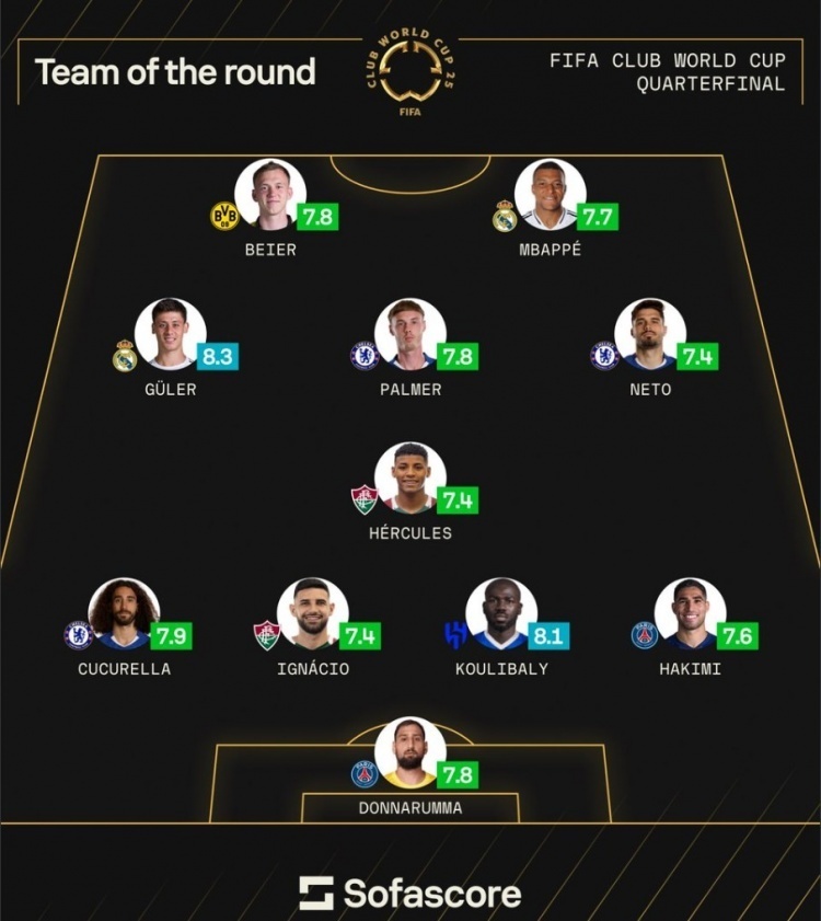 nba直播讯 北京时间7月7日,在世俱杯八强战全部结束后,sofascore统计了本届世俱杯八强战评分最佳阵容,姆巴佩领衔,帕尔默、多纳鲁马、阿什拉夫在列。
