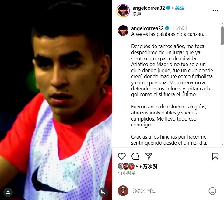 安赫尔-科雷亚写道:“有些心情难以言表,在历经这么多年后,我不得不向这个已成为生命一部分的地方道别。马竞不仅是我效力的俱乐部,更是我作为球员和男人成长的摇篮。在这里,我学会了为红白荣耀而战,懂得了每个进球都该像最后一球那样尽情呐喊。”
