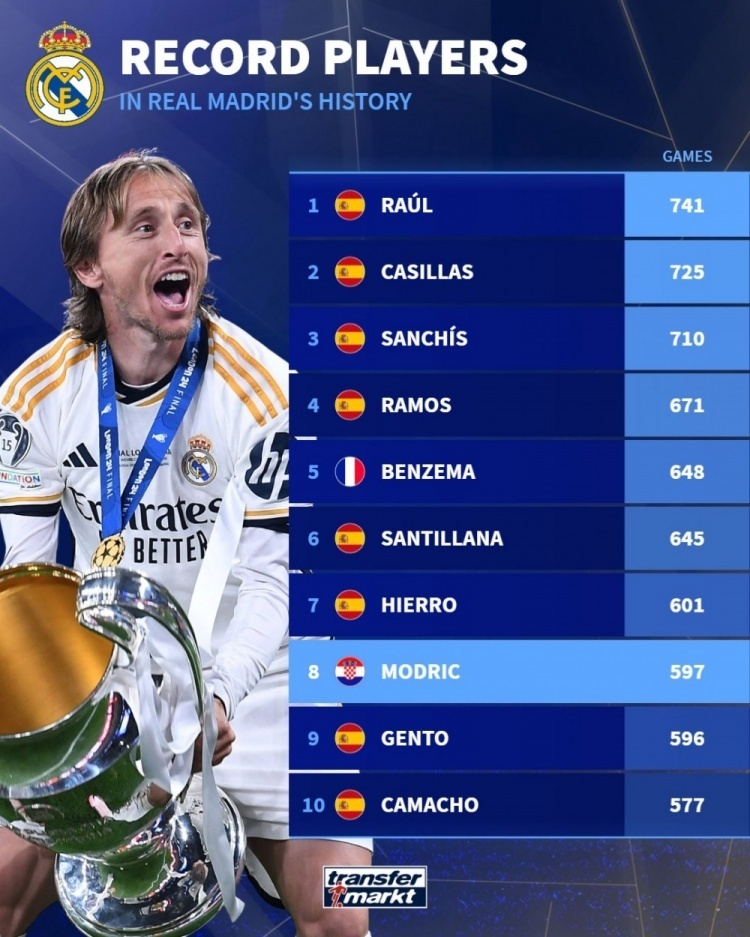 nba直播讯 北京时间7月10日,世俱杯皇马0-4被巴黎淘汰后,莫德里奇结束了自己的皇马生涯,转会至AC米兰,随后德国转会市场列出了皇马队史出场榜,劳尔741场居首,莫德里奇597场排名第8位。
