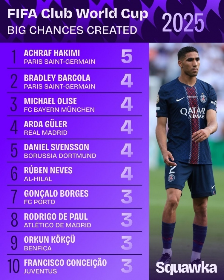 nba直播讯 北京时间7月11日,本届世俱杯仅剩巴黎vs切尔西的决赛,数据机构squakwa也统计了本届赛事创造重大机会情况,巴黎后卫阿什拉夫居首,巴尔科拉、奥利塞、居勒尔、丹尼尔-斯文松、鲁本-内维斯各四次。