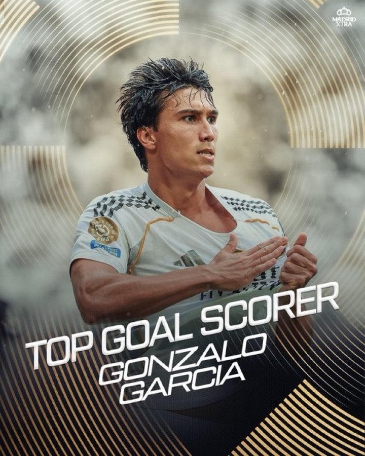 “贡萨洛-加西亚荣获世俱杯最佳射手奖,这位皇马前锋打入4粒进球,与迪马利亚(本菲卡)、吉拉西(多特蒙德)和马科斯-莱昂纳多(利雅得新月)并列射手榜首位。但他凭借多出1次助攻的优势成功打破平局,将这一奖项收入囊中。”