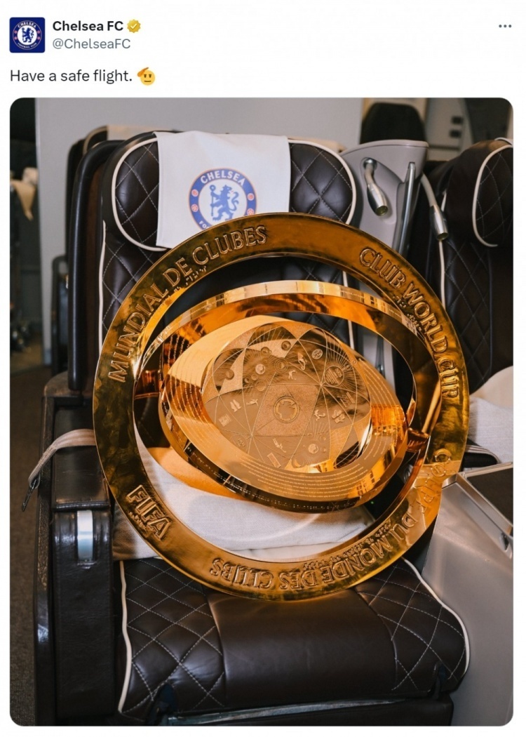 切尔西3-0击败巴黎夺得世俱杯冠军,球队正把奖杯带回伦敦,俱乐部社媒晒出飞机上的奖杯,配文:“一路平安。”