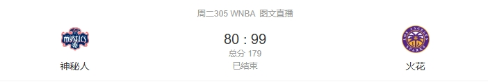 洛杉矶火花:D-汉比26+4+6、里奇亚-杰克逊22+2+3、凯尔西-普拉姆20+6+4、阿祖拉-史蒂文斯15+2+8 华盛顿神秘人:夏奇拉-奥斯汀16+2+8、萨顿14+4+3、索尼娅-西特隆8+6+6、伊莉亚芬8+1+8