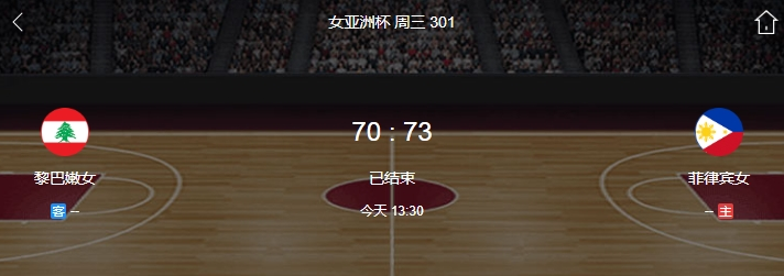 nba直播讯 北京时间7月16日,女篮亚洲杯小组赛 第3轮,菲律宾女篮对阵黎巴嫩女篮。半场菲律宾女篮41-37黎巴嫩女篮,最终菲律宾女篮73-70黎巴嫩女篮。菲律宾女篮纳奥米-娜塔莉15分4板3助,杰克-阿尼曼14分16板5助;黎巴嫩女篮吉莉安-阿切尔23分10板3助,丽贝卡-艾克利13分7板4助。