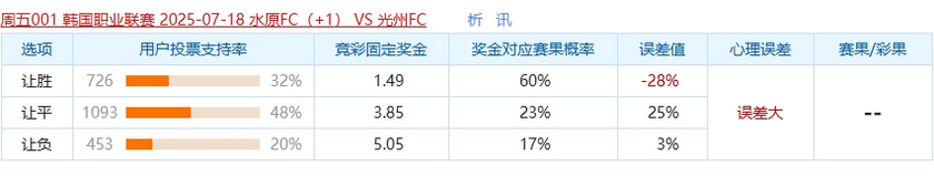 本场比赛中,选择水原FC让球负的球迷偏少了,只有32%的球迷选择让球胜选项,这场比赛中,大家都看好主队光洲FC能够赢或者大胜赢得这场比赛,不看好水原FC能在主场保住分数,但是这也与奖金对应赛果概率的60%相差28%。