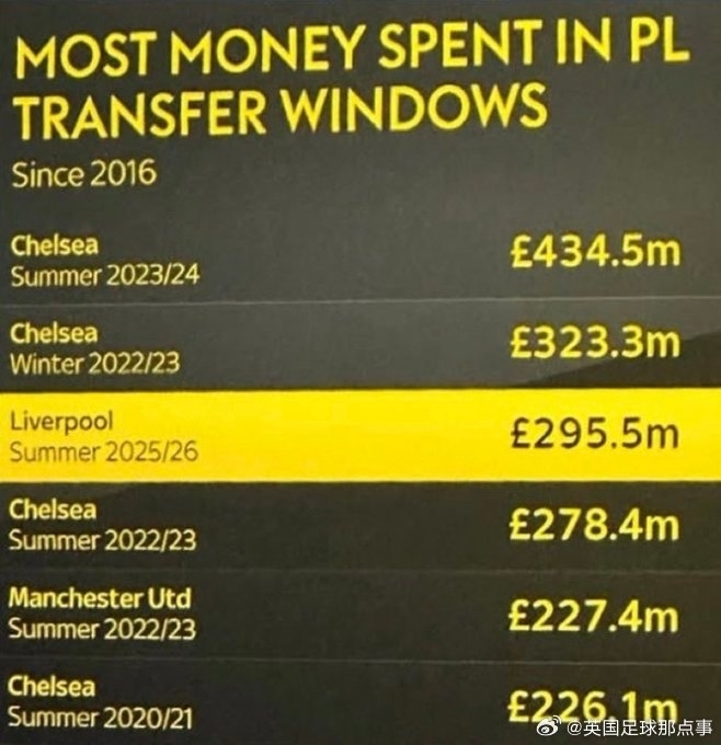 nba直播讯 2025年7月24日,根据自媒体英国足球那点事的消息,列出了一张英超转会窗砸钱的榜单,切尔西4.35亿镑第1,利物浦2.95亿镑第3,2016年以来前6排名有4次切尔西。