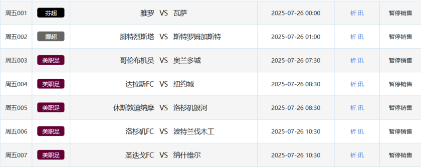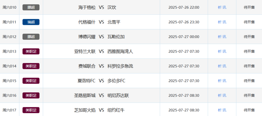 北京时间7月25日,本周五竞彩开售7场比赛,包括1场芬超、1场挪超和5场美职联。本周六竞彩开售17场,涵盖3场韩职、4场挪超、3场瑞超、2场芬超和5场美职联。周日竞彩开售11场,包括1场日职、3场韩职、4场瑞超、2场挪超和1场芬超。下周一竞彩开售2场,分别为1场芬超和1场瑞超。