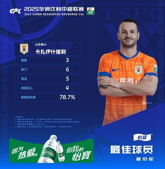nba直播讯 北京时间7月30日,中超官方宣布,在山东泰山迎战梅州客家的比赛中,卡扎伊什维利上演帽子戏法,最终帮助山东泰山3比0取胜,当选为第18轮最佳球员。