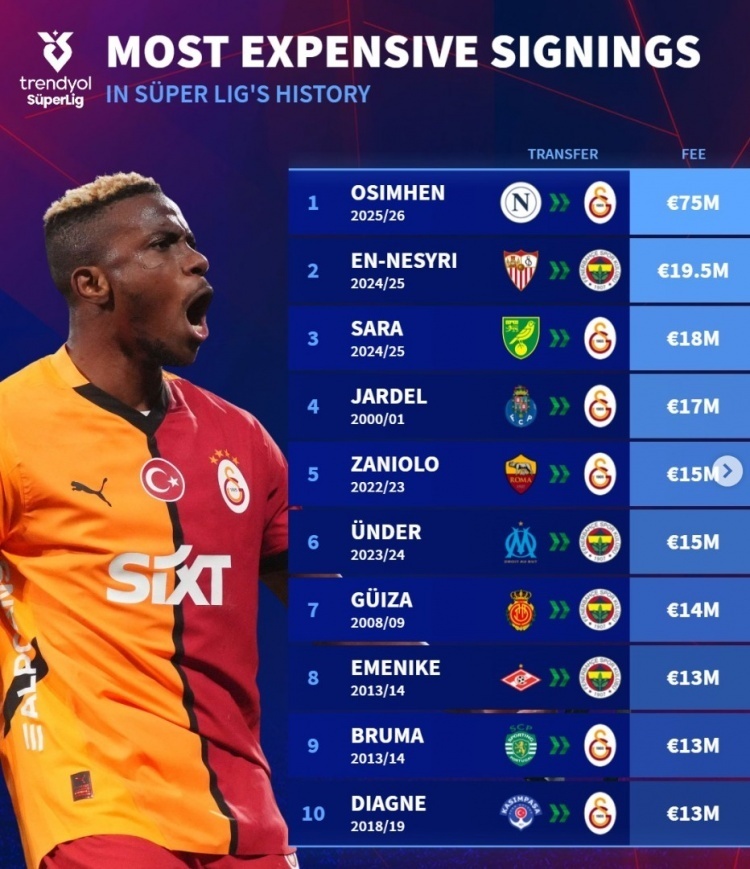 nba直播讯 北京时间7月31日,随着奥斯梅恩即将转会加拉塔萨雷,德转统计了土耳其球队历史最贵买人榜,奥斯梅恩从那不勒斯→加拉塔萨雷花费7500w欧居首,恩内斯里、扎尼奥洛在列。