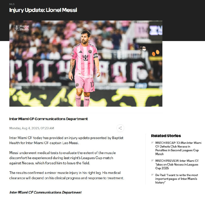 迈阿密国际足球俱乐部今日发布了球队队长梅西伤情通报。
