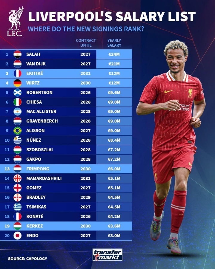 nba直播讯 北京时间8月4日,德转根据著名足球金融机构capology的数据,列出了利物浦目前队内的薪资排行,萨拉赫2400万欧居首,范迪克2100万次席,新援埃基蒂克和维尔茨以1200万欧年薪并列第3,弗林蓬600万欧位列第13,科尔克兹仅列第19。