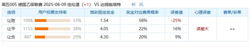 本场比赛中,选择纽伦堡获让球胜的球迷偏少了,只有33%的球迷选择让球胜选项,这场比赛中,大家都看好客队达姆施塔特能够赢或者大胜赢得这场比赛,不看好纽伦堡能在主场保住分数,但是这也与奖金对应赛果概率的58%相差25%。