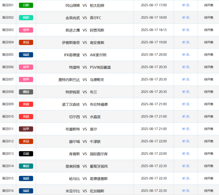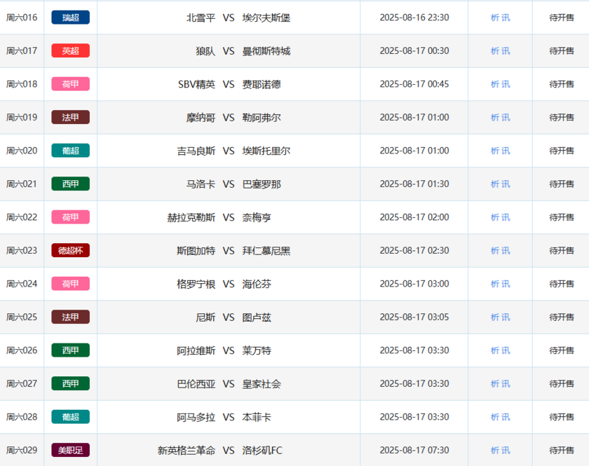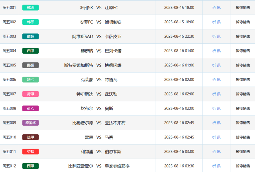 北京时间8月15日,本周五竞彩开售12场比赛,包括2场韩职、1场英超、1场荷乙、2场西甲、1场挪超、1场法乙、1场荷甲、1场德国杯、1场法甲和1场葡超。本周六竞彩开售29场,涵盖3场日职、1场日职乙、1场韩职、5场英超、2场瑞超、3场英冠、3场荷甲、2场法甲、3场葡超、3场西甲、1场德国超级杯、1场芬超和1场美职联。周日竞彩开售33场,包括1场日职、1场韩职、5场荷甲、2场英冠、3场瑞超、4场挪超、3场英超、5场法甲、1场芬超、4场葡超、3场西甲和1场美职联。下周一竞彩开售8场,共有2场德国杯、1场法乙、1场英超、1场西甲、1场芬超、1场葡超和1场瑞超。
