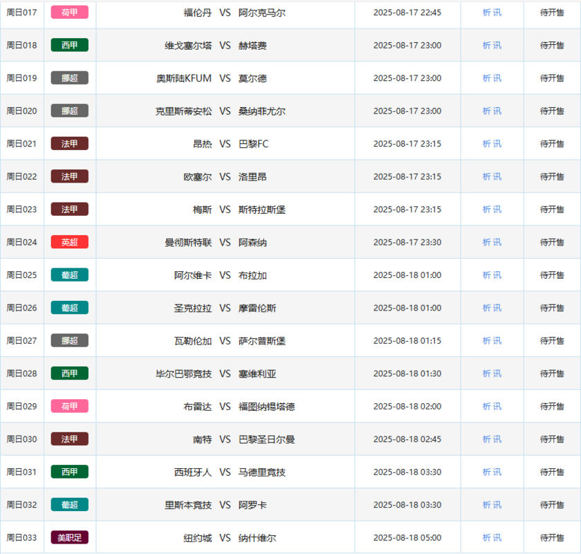 周日竞彩待开售33场比赛
