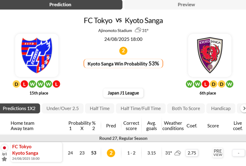 - Kyoto Sanga have seen over 2.5 goals scored in their 3 most recent encounters with FC Tokyo (J1 League).