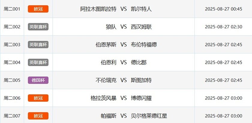 1️⃣周二(8月26日)待开售场次有7场,包括3场欧冠资格赛第二回合,3场英联杯比赛和1场德国杯比赛。