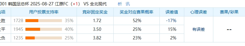 本场比赛中,选择江原FC让球胜的球迷偏少了,只有35%的球迷选择让球胜选项,这场比赛中,大家都看好客队全北现代能够赢或者大胜赢得这场比赛,不看好主队江原FC保住分数,但是这也与奖金对应赛果概率的52%相差17%。