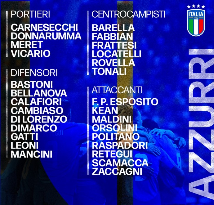 后卫:巴斯托尼(国米)贝拉诺瓦(亚特兰大)、卡拉菲奥里(阿森纳)、坎比亚素(尤文)、迪洛伦佐(那不勒斯)、迪马尔科(国米)、加蒂(尤文)、莱奥尼(利物浦)、曼奇尼(罗马)