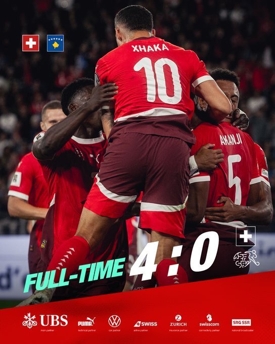 世欧预分组赛B小组第5轮,瑞士坐镇主场迎战科索沃。此役上半场,瑞士进攻全面开花,阿坎吉首开记录,恩博洛梅开二度且威德默攻入一球。易边再战,双方均未破门。全场比赛结束,瑞士4-0科索沃。