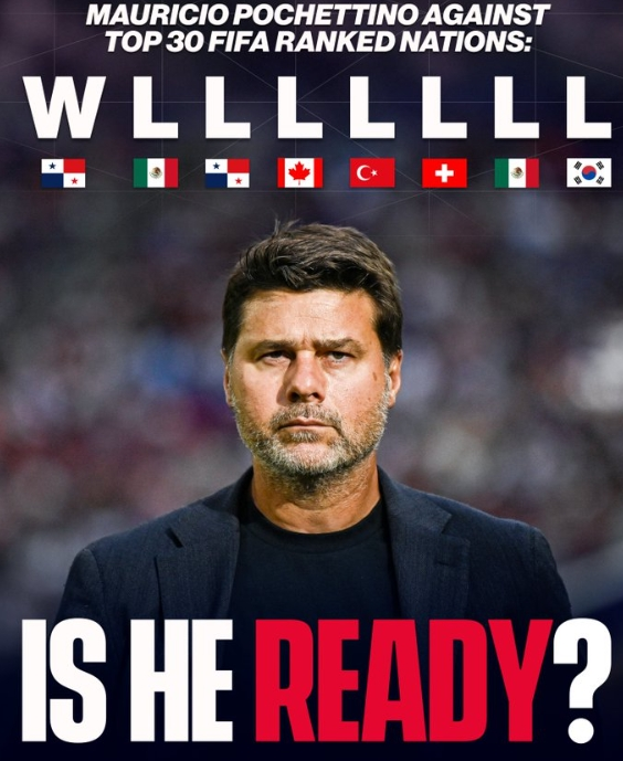 根据统计,自波切蒂诺上任以后,美国队在面对世界排名前30的球队时,1胜7负,战绩糟糕。对此,美国媒体Golaz0America晒出了波切蒂诺战绩海报,上面写道:“他真的准备好了吗?”他们评论道:“对于波切蒂诺率领的美国男足来说,与一些世界顶级球队交手非常艰难,