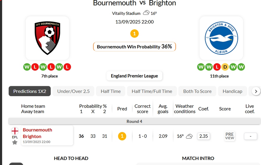 伯恩茅斯在过去6场对阵布莱顿的比赛中,在所有比赛中只取得了1场胜利