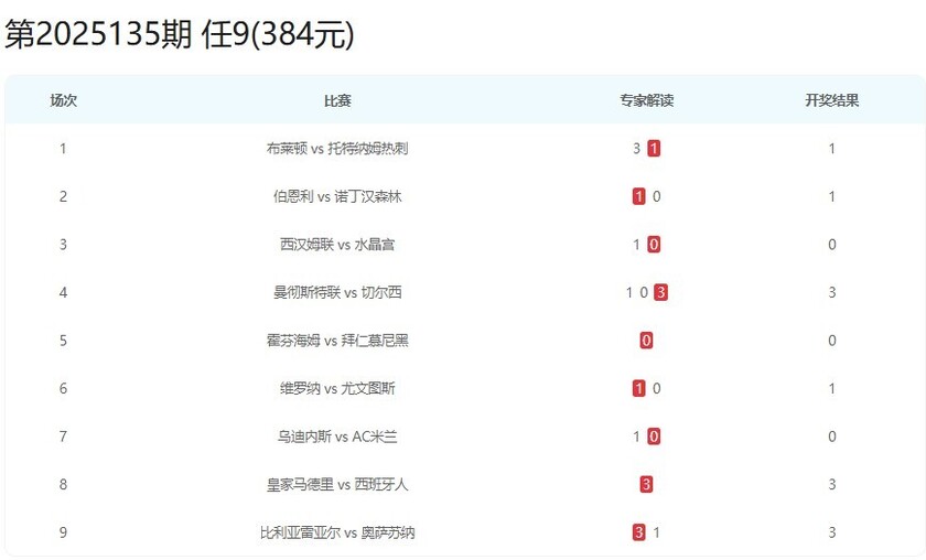 上期任九中我们384元私推方案成功斩获1024元奖金,可惜复选策略中尤文冷平未能精准捕捉略有遗憾。