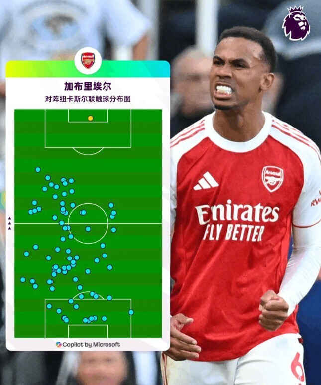 加布里埃尔的出色表现不仅体现在这次绝杀上,赛后英超官方公布的触球分布显示,他的大多数触球集中在中后场,但唯一一次在对方禁区内的触球便转化为了致胜进球。自2020年9月为阿森纳出战以来,加布里埃尔已在英超赛场打入18球,成为枪手进攻端的重要武器。