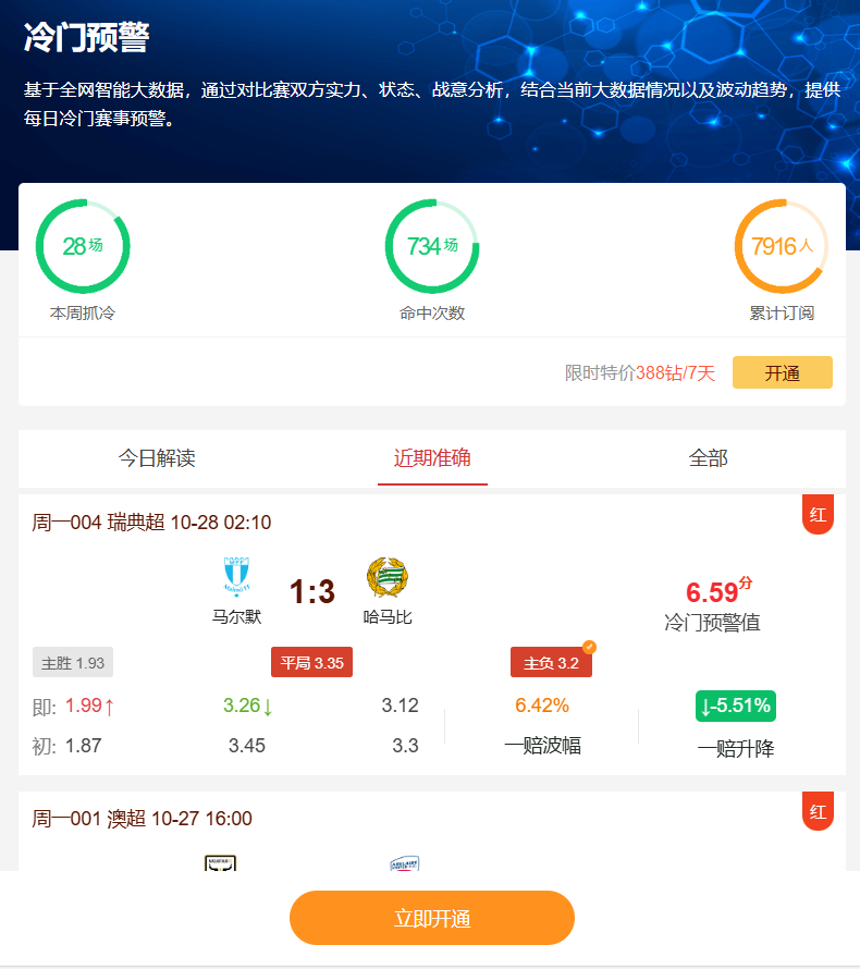 昨晚nba直播冷门预警工具再次成功预测2场比赛赛果,昨日瑞典超马尔默 VS哈马比的比赛中,尽管初始赔率显示马尔默占优(胜平负赔率1.93:3.35:3.2),但比赛最终打出了1-3主负的爆冷战果;早场澳超麦克阿瑟FC 2-1胜阿德莱德联的冷门结果同样命中。一众预测充分展现了我们工具的精准预测能力。