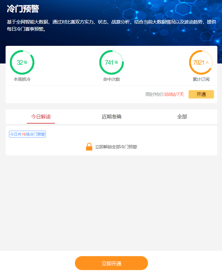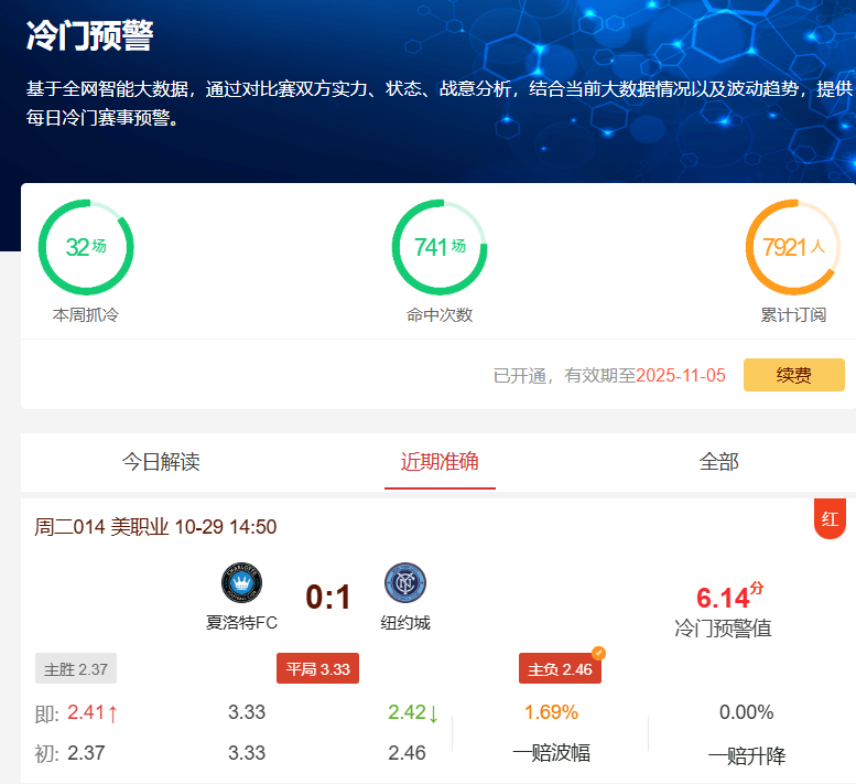 昨晚nba直播冷门预警工具再次成功预测7场比赛赛果,昨日德国杯奥格斯堡VS波鸿的比赛中,尽管初始赔率显示奥格斯堡占绝对优势(胜平负赔率1.39:4.26:5.7),但比赛最终打出了0-1主负的惊天巨冷;同时德国杯的海登海姆0-1负汉堡、法兰克福1-1平多特蒙德、圣保利1-1平霍芬海姆、沃尔夫斯堡0-1负荷尔斯泰因等6场冷门结果同样命中。一众预测充分展现了我们工具的精准预测能力。