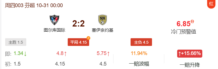 昨晚nba直播冷门预警工具再次成功预测5场比赛赛果,昨日芬超图尔库国际VS塞伊奈约基的比赛中,尽管初始赔率显示图尔库国际占绝对优势(胜平负赔率1.5:4.15:4.5),但比赛最终打出了2-2平的大冷门;同时意甲的比萨0-0平拉齐奥、卡利亚里1-2负萨索洛,沙特联达马克1-1平哈萨征服以及荷兰杯鹿特丹斯巴达5-2胜格罗宁根4场冷门结果同样命中。一众预测充分展现了我们工具的精准预测能力。