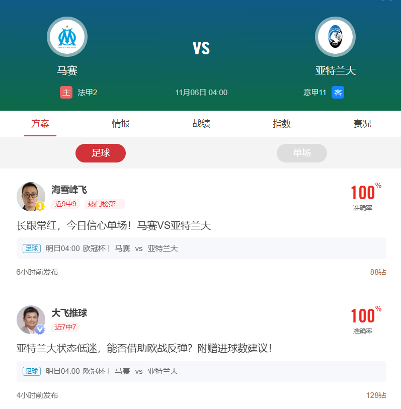 历史交锋方面,亚特兰大稍占心理优势,近2次交手取得1胜1平保持不败。马赛虽拥有主场之利且进攻火力强劲,但防守漏洞突出且伤病问题严重;亚特兰大则防守稳健、战术纪律严明,但进攻效率有限且同样受到伤病影响。综合来看本场比赛马赛胜方向不稳须防平。