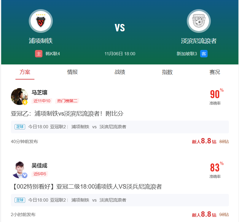 周四002亚冠乙推荐:浦项制铁VS淡滨尼流浪