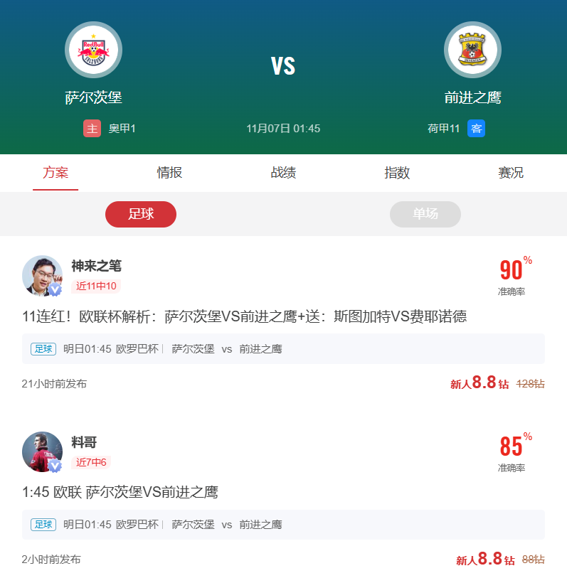 周四011欧罗巴推荐:萨尔茨堡VS前进之鹰